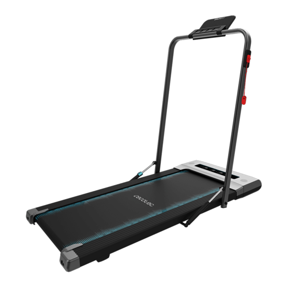 - Cinta de andar ultracompacta, con amplia superficie de carrera de 100×40 cm, barra de sujeción plegable horizontalmente, altavoces con funcionamiento Bluetooth, soporte para tablet, pantalla LCD de alta visibilidad, mando a distancia, velocidad de hasta 6 Km/h y potencia de 550 W / 0.75 CV.