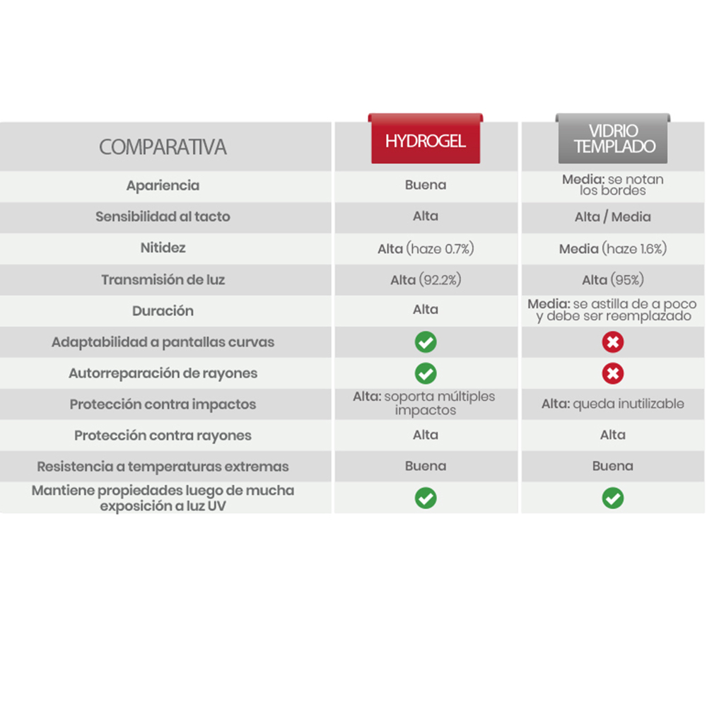 - Hydrogel es flexible y resistente. Se adapta a cualquier tipo de pantalla,