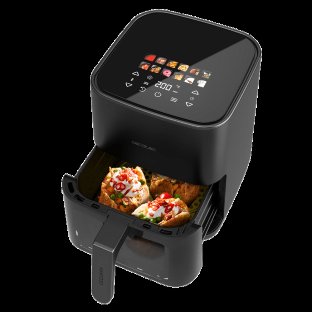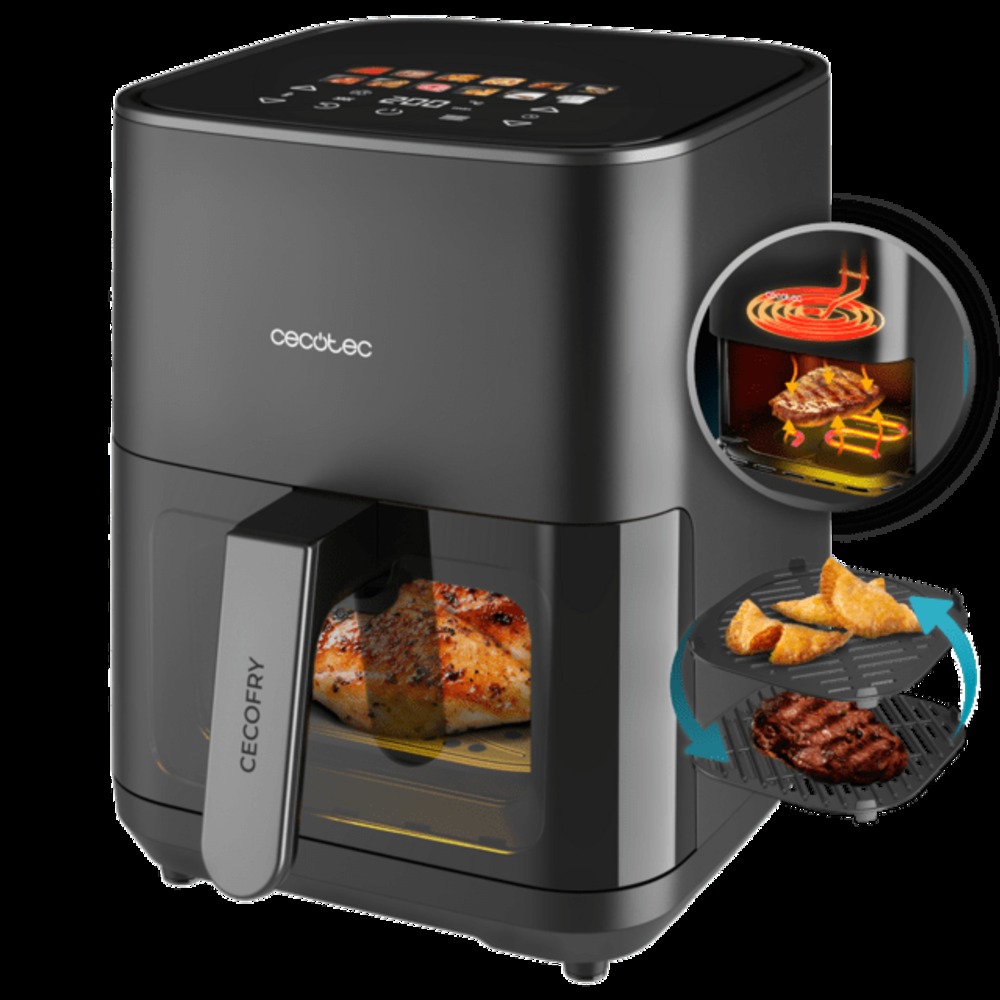 - Platos saludables con solo una cucharada de aceite. Su potencia de 1900 W permite cocinar recetas con una cucharada de aceite, reduciendo la cantidad de grasas en tus preparaciones sin sacrificar su sabor ni su textura.