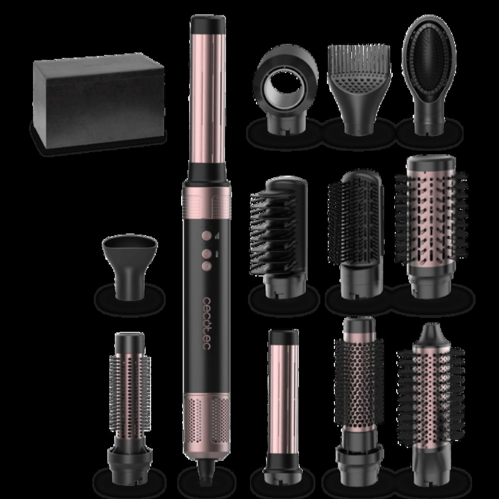 - 12 cabezalesconsigue una mayor variedad de peinados con sus diferentes cabezales: secador, cepillos de 33 mm, 40 mm y 70 mm, 2 peines, 2 cilindros rizadores (derecha e izquierda), cepillo desenredante, peine voluminizador, concentrador y cepillo de púas retráctiles.