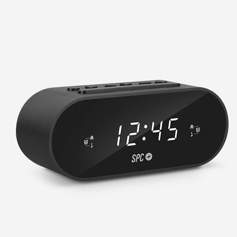 - Radio despertador LED compacto con brillo regulable.